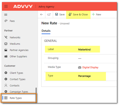 1. Navigate to Agency Settings > Customer> Rate Types and click +NEW