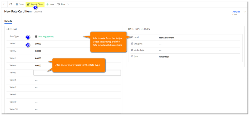 5. Enter the rate value in the available fields. There are up to 12 Value fields available per rate. Save and Close.