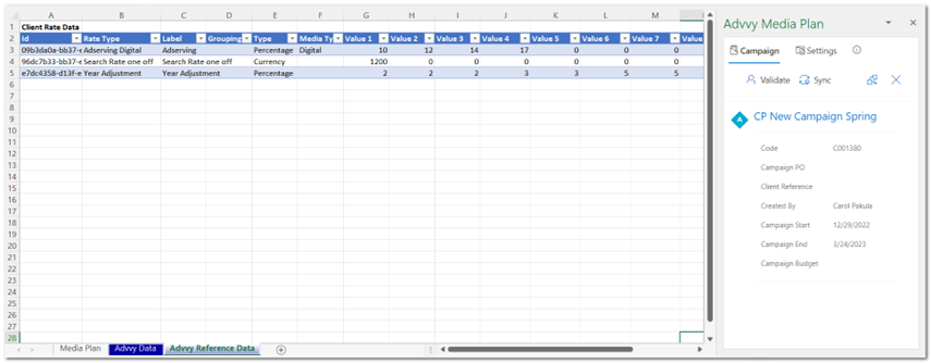 The Advvy Reference Tab and the Client Rate Data Table is controlled by Advvy and the Add-in. This is a dynamic table, so if the Excel Media Plan is connected to a different campaign for a different client, it will delete all the previous client rates and replace them with the new client rate data.