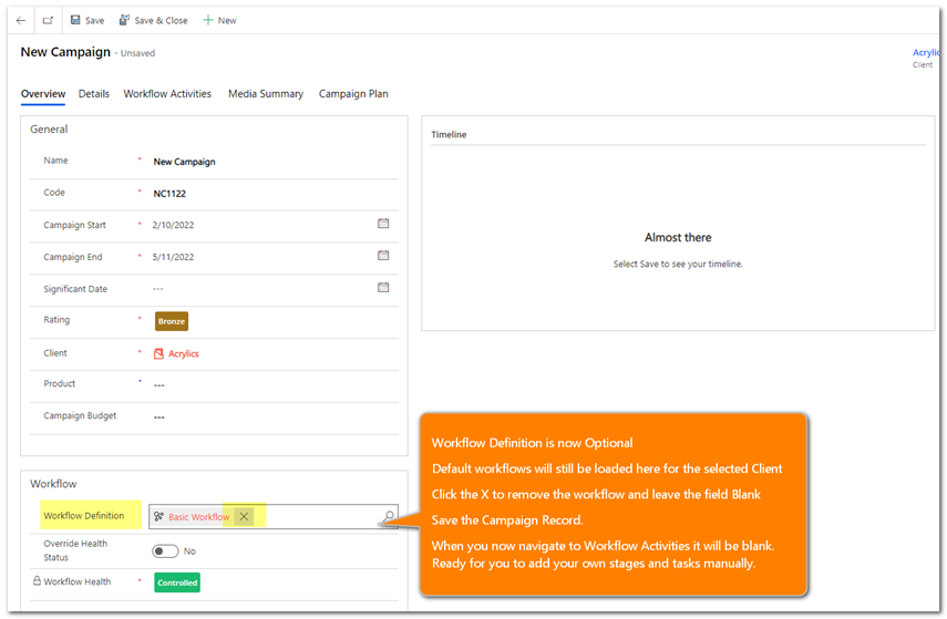 This new approach now allows for a Campaign to be created without a workflow (note default workflows will still be available for selection).