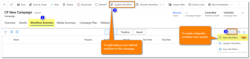 • If you opt to update workflow from the ribbon, then the campaign will be locked to the selected pre-defined workflow. You can still modify the workflow, but you cannot create one from scratch.