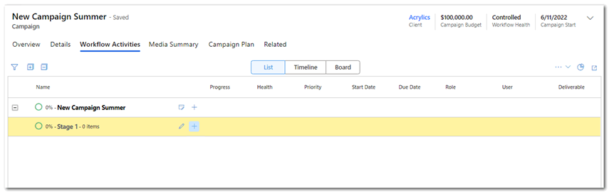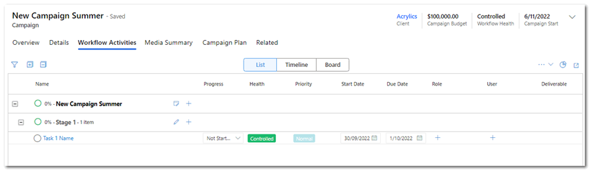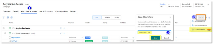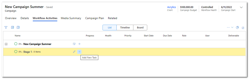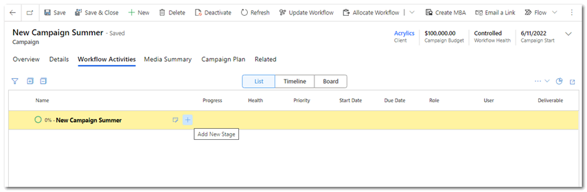 2. Once you have selected the client, any default workflow will be displayed. [if you save the new campaign record at this step the predefined workflow will be applied].