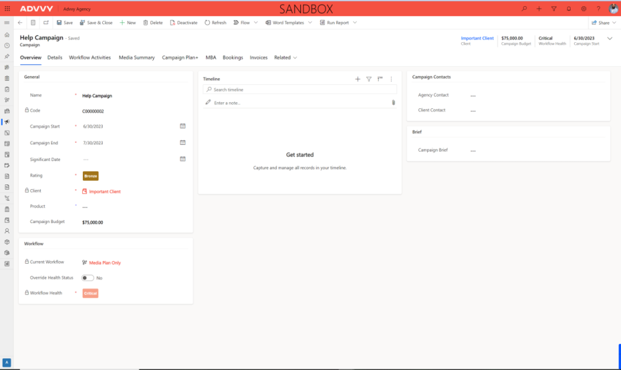 The Timeline allows you to capture notes, attachments and updates from managing the campaign. See Timeline for more information