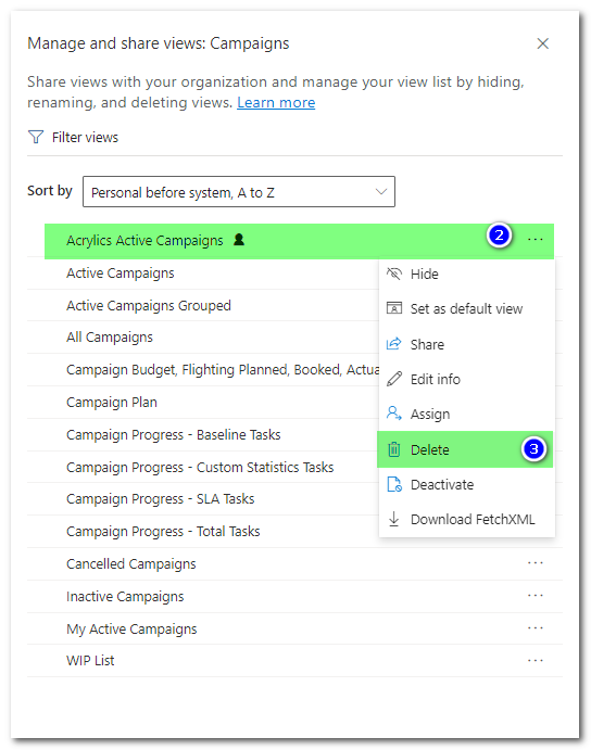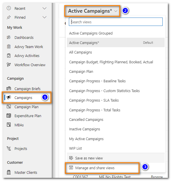 1. Navigate to the Campaigns Entity – it displays the default view of Active Campaigns