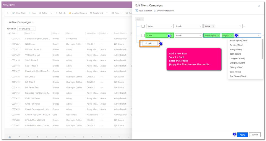 In this example, we want to see all Campaigns for the clients called Acrylics and Acrylic Spice