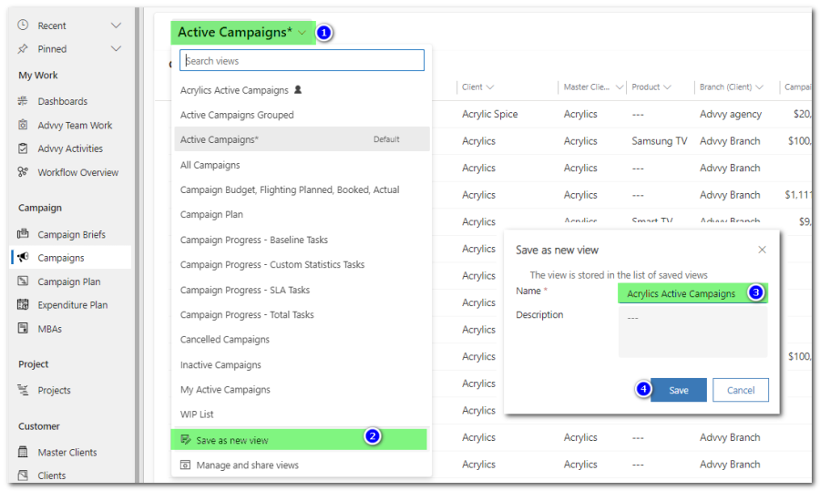 Creating a campaign-specific view in the Campaigns section of Advvy