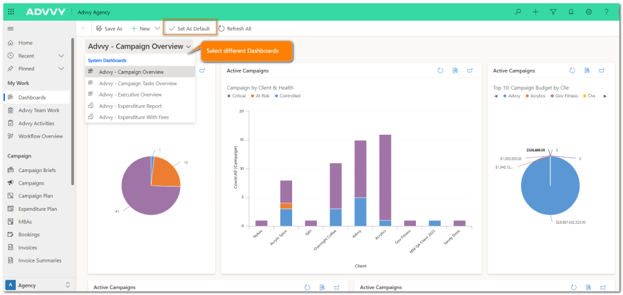 Tip –Use the dropdown list to find your favourite dashboard and set it as default.