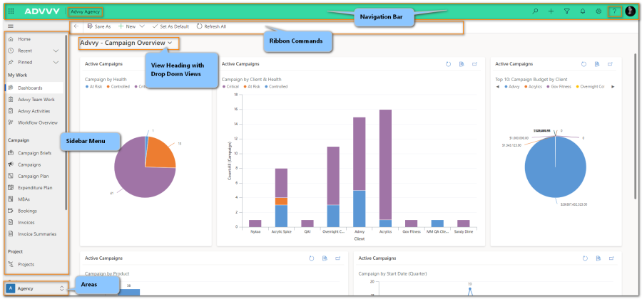Common operational menu items, lists, dashboards are found in Agency for easy navigation.