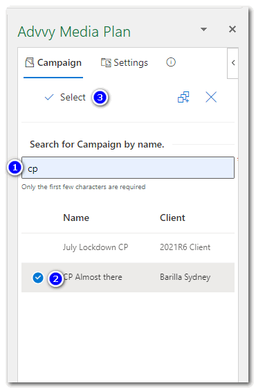 - Navigate to the Advvy Media Plan pane, in the search box enter the first few characters of the campaign name and press ENTER to list any existing Advvy campaigns.