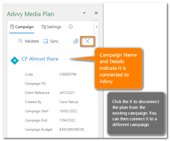 If you have selected the wrong campaign, that’s OK, simply click on the big ‘X’ button to disconnect the plan from the campaign.