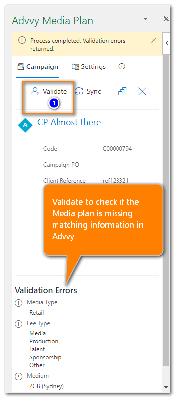 - Correct any validation errors in your media plan (or ask your admin to add new entries into Advvy) and repeat steps 1-3 again, until there are no more errors.