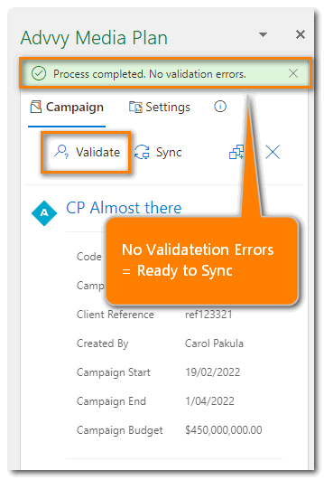 - If no errors are found, your Media Plan is valid and ready for Sync.