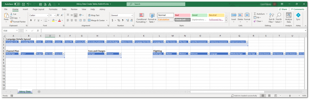 Once we combine your Media Plan with our Advvy Data tab the plan is ready to be synced to Advvy using the Advvy Add-in for Excel.