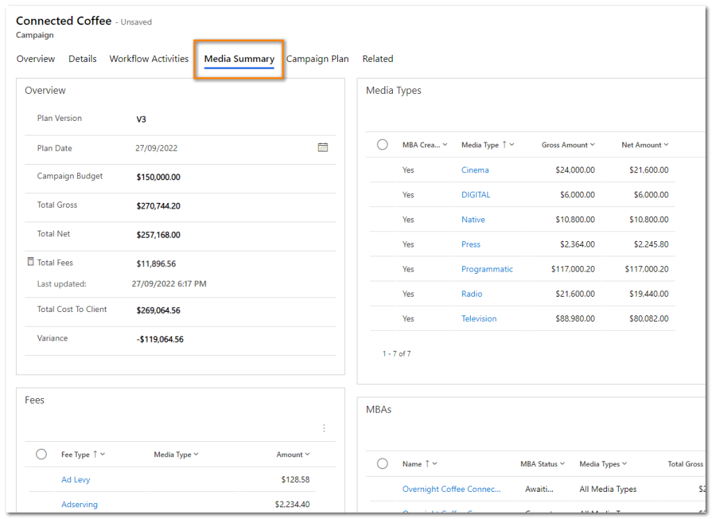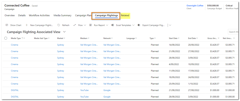 - In the Campaign record on the Media Summary, Campaign Plan and Related Campaign Flightings tabs