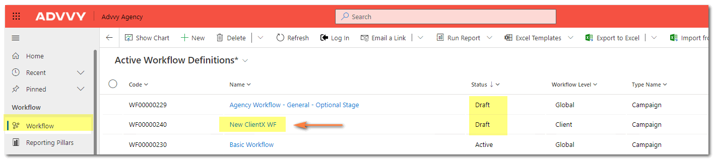 In Advvy, when you define a Workflow it will begin with a status of “Draft”.