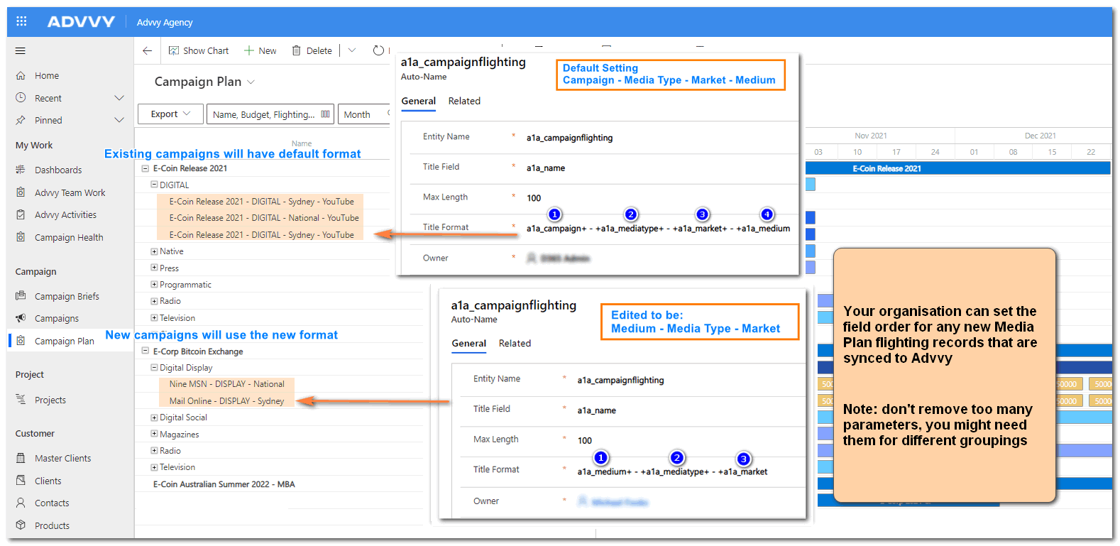 In the example below the a1a_campaignflighting Auto-name record was edited to display only 3 fields in the following order: