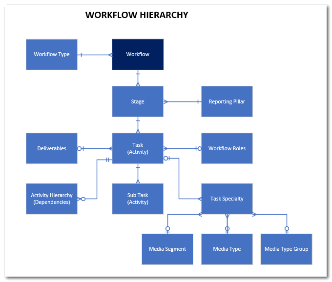 The Workflow entity hierarchy diagram below shows the relationship between Workflows, Reporting Pillars, Deliverables and Roles.