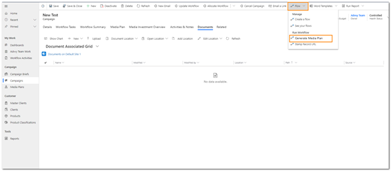 Advvy has created a Microsoft Flow that automates the copying of the Media Template and creating a Master Campaign Media Plan for the campaign record. This flow also saves the Media plan in the SharePoint document location behind each campaign record.