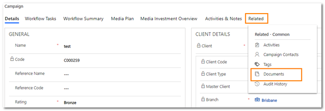 - Once a new campaign is created, click on the ‘Related’ tab and select ‘Documents.
