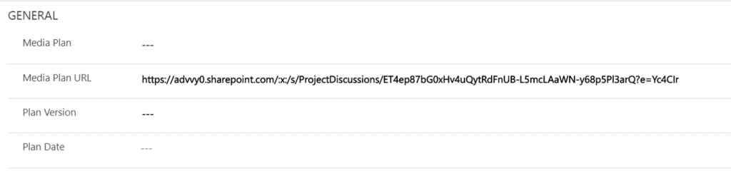 Advvy suggests that your agency work towards having one master media plan template that can be used for all clients. Within Advvy there is a form for an agency to store the URL of the master media plan, so it is easily retrievable by staff. This Template can be stored in a Sharepoint location that can be accessed by all teams.
