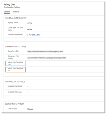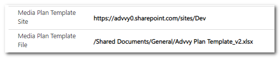 - Locate the “SharePoint Settings”, “Media Plan Template Site” and “Media Plan Template File”